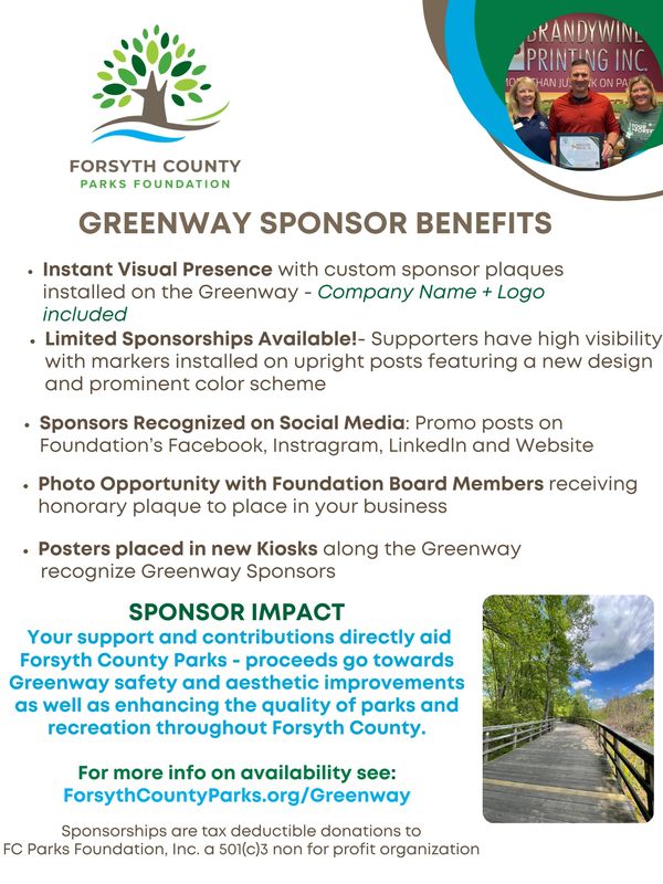 Your support and contributions aid Forsyth County Parks - Proceeds go to Greenway safety and aesthetic improvements as well as enhancing the quality of parks and recreation in Forsyth County.